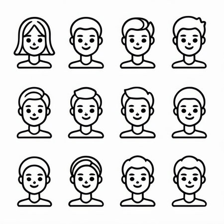 A diverse collection of simple outline avatar icons representing various user profiles, including men and women with different hairstyles, beards, and glasses. Ideal for web interfaces, social networks, user management systems, and other digital applications requiring diverse user representations.
