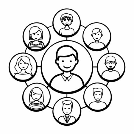 A group of young adults is depicted in a vibrant illustration, each with unique expressions. The artwork showcases a range of skin tones and clothing styles. The composition is bright, suggesting a cheerful environment, suitable for various editorial and commercial applications.