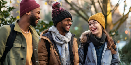 A Joyful friends laughing together outdoors in vibrant setting