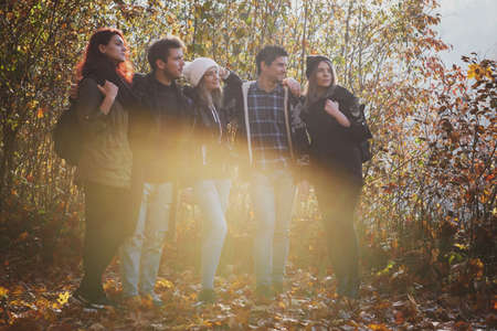 Few friends are enjoying sunny autumn weather while hiking in the forest.