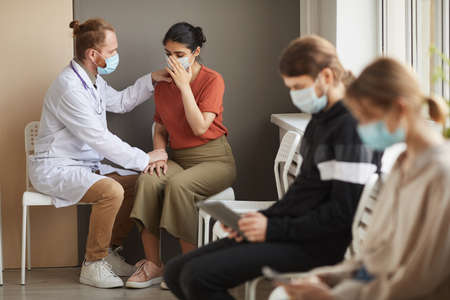 Male doctor supporting the patient while she crying they sitting at the corridor of hospital with other people