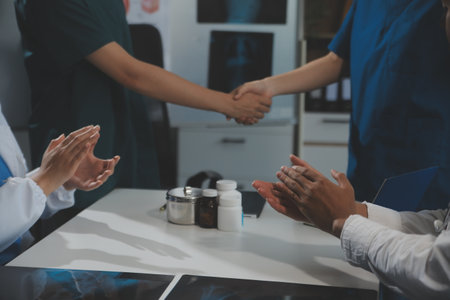 Doctor handshake and partnership in healthcare, medicine or trust for collaboration, unity or support.Team of medical experts shaking hands in teamwork for or success in hospital