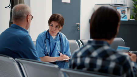 Medical assistant doing consultation with senior patient in waiting area, sitting in hospital reception lobby. Female nurse talking to retired person about disease diagnosis and healthcare. Close up.