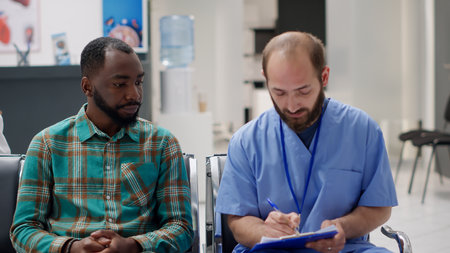 African american patient going in medical office with asian nurse to attend checkup examination at clinic. Man doing healthcare consultation with physician, waiting in hospital reception.