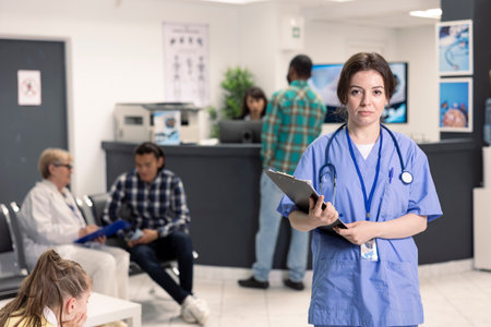 Caucasian nurse in blue scrubs stands in hospital waiting room, holding clipboard with medical documents. Female healthcare worker represents professional and reliable clinic service.
