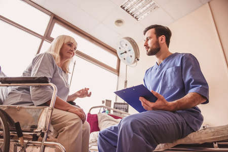 Beautiful old lady is talking to a handsome doctor while sitting in the wheelchair in hospital ward