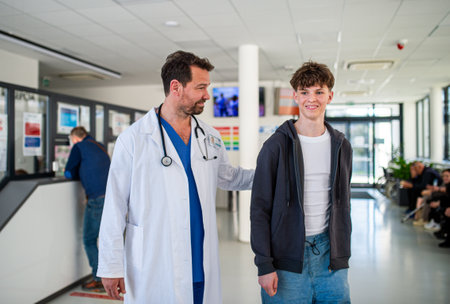 Doctor walking with teenage patient after successful medical procedure in hospital.