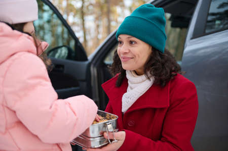 Mom and daughter enjoy spending time together in snowy woodland on beautiful sunny winter cold day, taking break for lunch while traveling by car. Enjoy winter holidays and discover wonderful nature