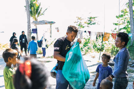 Sibuan, Malaysia - November 26, 2019: Visitors distributing snacks and goods to the Bajau Laut kids in their village.