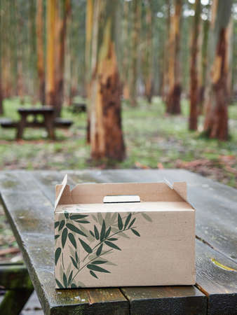 cardboard box with green leaves on a wooden picnic table in a forest with trees in the background, autumn or winter. Plastic free, zero waste and sustainable packaging concept