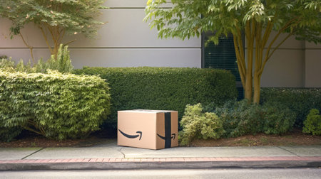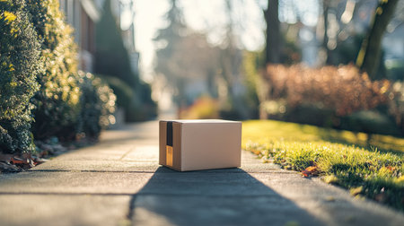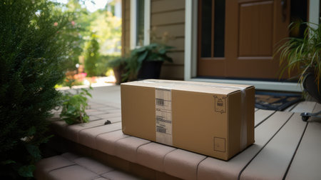 Delivered parcel box outside on sidewalk near house entrance. Amazon Prime shopping. Generative Ai
