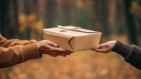 A person holding a cardboard box with a blurred background and space for your text