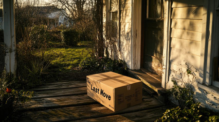 A cardboard box sits at the entrance of a home, flanked by vibrant flowers and lush greenery, creating a serene and welcoming outdoor scene.