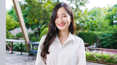 Asian beautiful woman looking to camera with smile and happiness on her leisure day