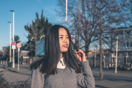 Front view of young stylish chinese woman looking serious at camera. Close up portrait of a relaxed asian lady standing outdoors at city street.