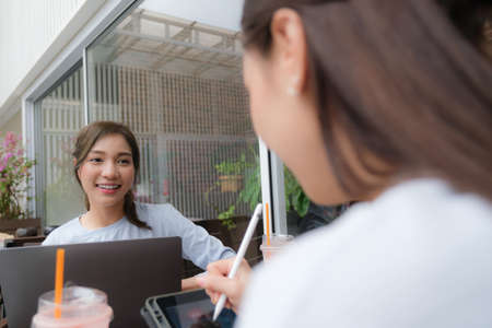 young asian adults men and woman sitting chatting relaxing in outdoor coffee shop