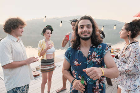 Portrait of young man drinking beer and smiling at camera while having fun at a party