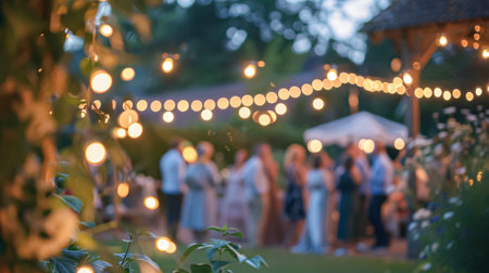 Outdoor wedding reception, warm glow of the lights creates a magical atmosphere as guests gather, the background is slightly blurred, joyful ambiance of the celebration, romantic and festive evening wedding celebration