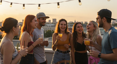 A group of friends enjoying a rooftop gathering at sunset, laughing and taking photos, with drinks in hand and city skyline in the background