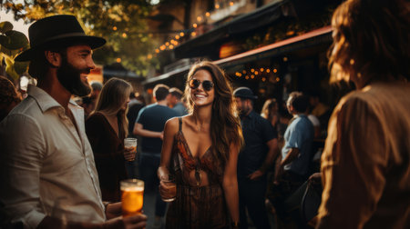 a vibrant outdoor music festival at sunset, capturing the energy of the crowd enjoying live music, drinks and the summer atmosphere. Fun and excitement