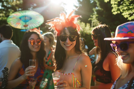 Embrace the festive vibes with these joyous souls at a sunlit outdoor party, where smiles, quirky sunglasses, and feathered headwear signal ultimate summer fun. Party Time. Summer Vibes. Generated A.I.