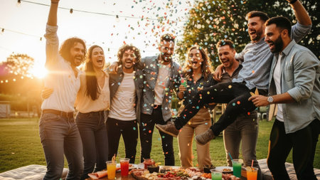 A group of diverse people celebrate outdoors, surrounded by confetti. The image displays a party atmosphere with varying expressions of joy and excitement. Warm tones and natural lighting suggest a daytime gathering. This image would be suitable for commercial use in advertising or promotional material.