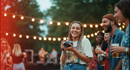 A group of friends enjoying a music festival outdoors, with one person holding a camera and smiling, string lights in the background, a lively atmosphere