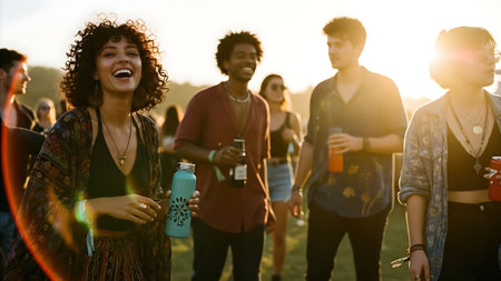 A joyful outdoor festival scene with diverse young adults enjoying music and dancing, colorful banners overhead, warm sunset lighting
