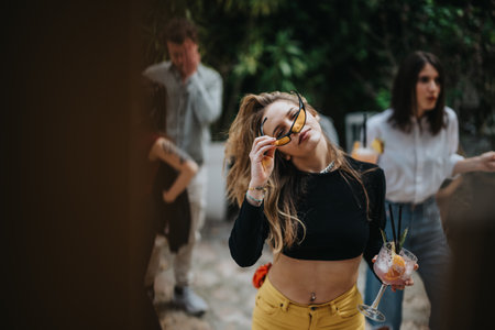 Cheerful young woman enjoying a lively outdoor party with friends in the summer.
