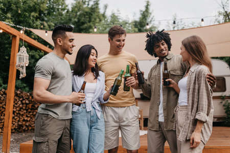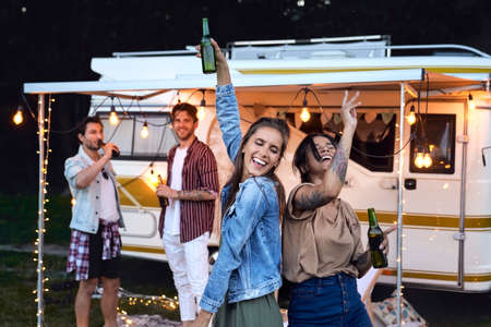 Group of happy multiracial young friends celebrating something, drinking beer, having party near camper van