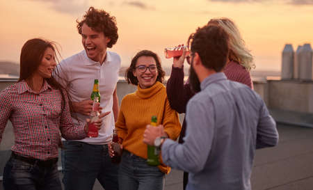 Happy multiracial young people toasting with bottles of beer at rooftop party