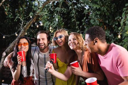 happy multiethnic friends with plastic cups singing karaoke in night garden