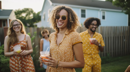 A vibrant summer gathering featuring friends enjoying food and drinks in a lush backyard. The scene captures joy, laughter, and connection in a lively outdoor setting.