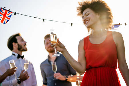 Young stylish friends having fun, hanging out and drinking wine at party on the rooftop terrace