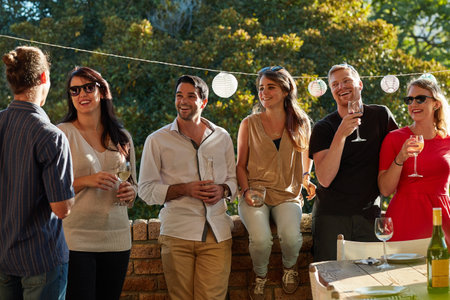 Diverse group of friends holding wine glasses and chatting while enjoying outdoor party in Summer