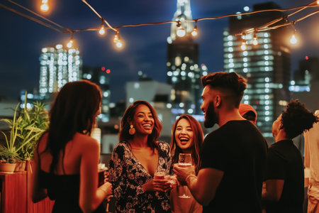 Friends enjoying drinks and laughter at a rooftop party with string lights and illuminated skyscrapers in the background.