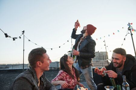 Evening is coming. That sunshine create warm atmosphere. Eating pizza at the rooftop party. Good friends have weekend with some delicious food and alcohol.