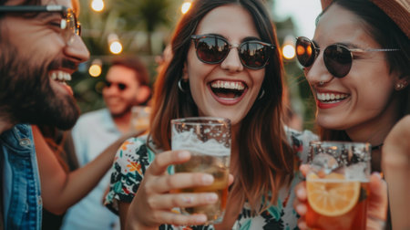 Friends enjoying a summer gathering outdoors with refreshing drinks and happy smiles