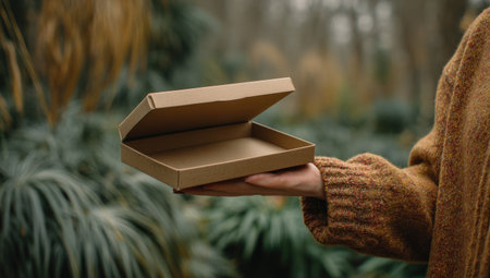 A person holds an open, empty cardboard box outdoors. The box and the person's clothing are shades of brown, contrasting with the blurred green background. The lighting appears natural, suggesting a daytime scene. The image could be used for product presentations, packaging concepts, or general advertising.