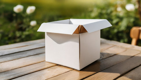 open cardboard gift box mockup with white wrapping paper on wooden table outdoors