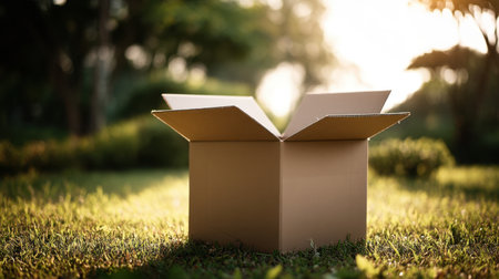 An opened cardboard box rests on green grass in a serene outdoor setting, illuminated by soft sunlight during golden hour, inviting curiosity and exploration.
