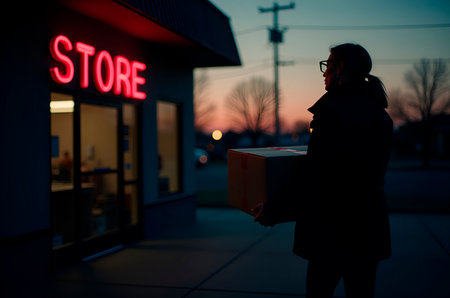 Person Carrying Package Near Storefront at Dusk with Neon Sign G