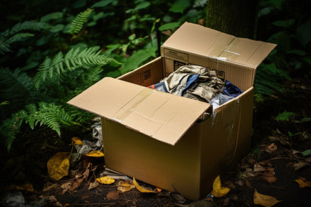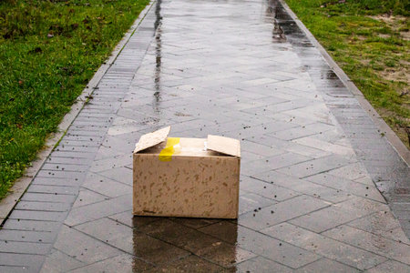 half-open cardboard parcel in a box in the rain. Timely delivery in any weather.