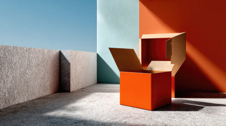 A modern, empty cardboard box in an orange hue sits against a vibrant backdrop of blue and textured surfaces, bathed in soft sunlight and deep shadows.