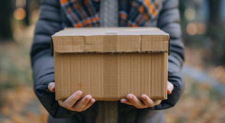 A delivery person dressed in a blue jacket and gloves is holding a cardboard parcel. The background shows a bustling street with shops and greenery. It is daytime.