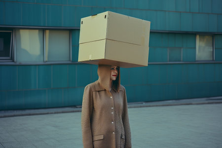 Enigma Unveiled: Captivating Anonymous Woman with Box on Head Enchants Downtown Building -ar 3:2