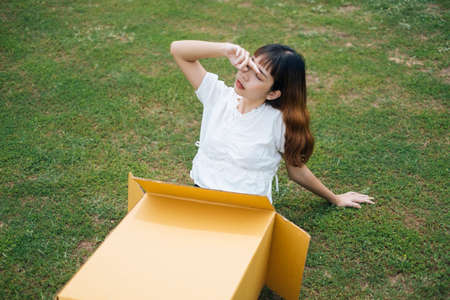 Young asian thai woman hipster curly hairstyle on white dress waking up in the moring from cardboard box on green field.