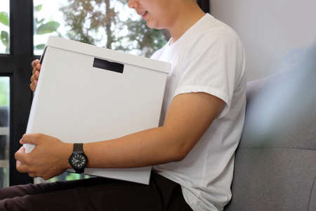 Surprised, pleased bearded man unpacks a delivered box with a parcel or a gift. Unboxing inside view. Copy space.