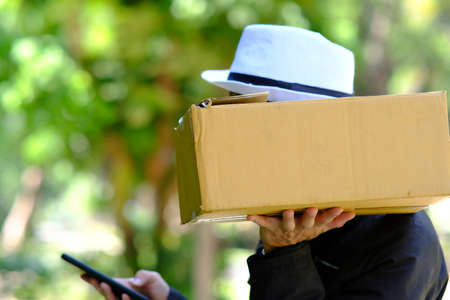Delivery man holding cardboard box and using mobile phone, online shopping concept