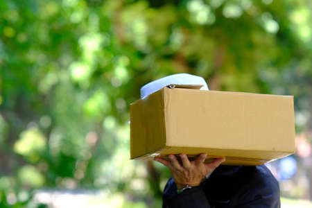 Delivery man holding cardboard box on blurred green nature background. Delivery service concept.